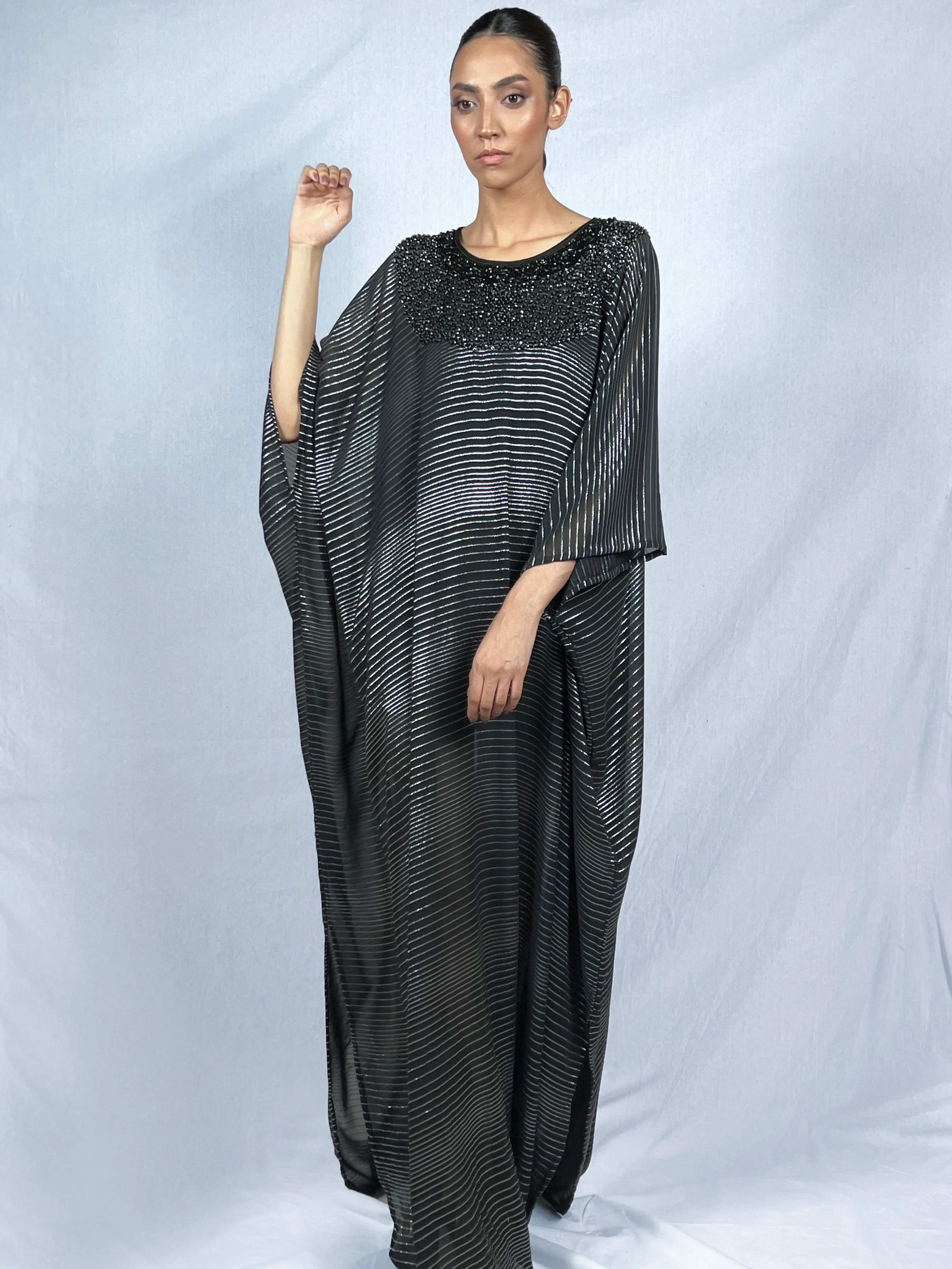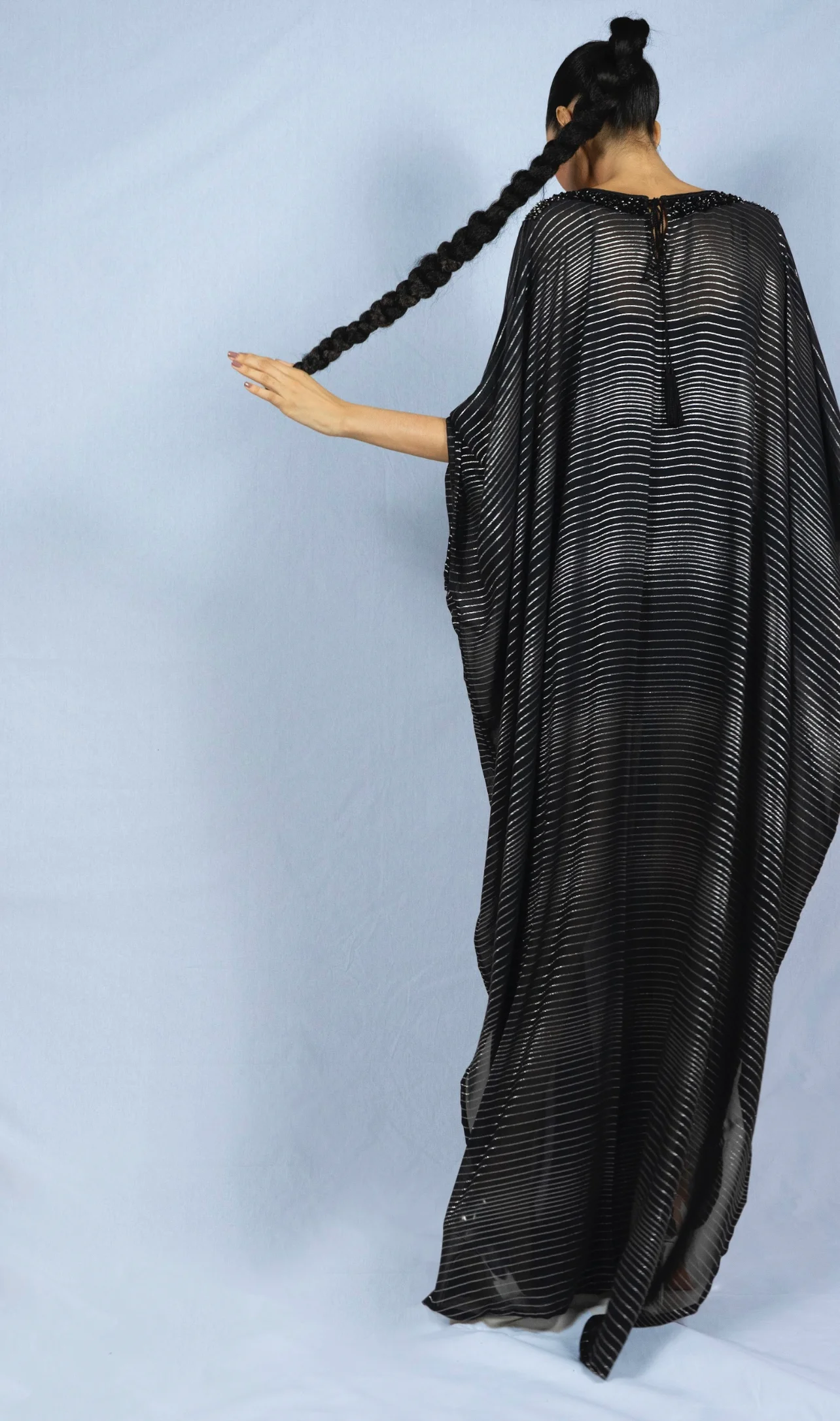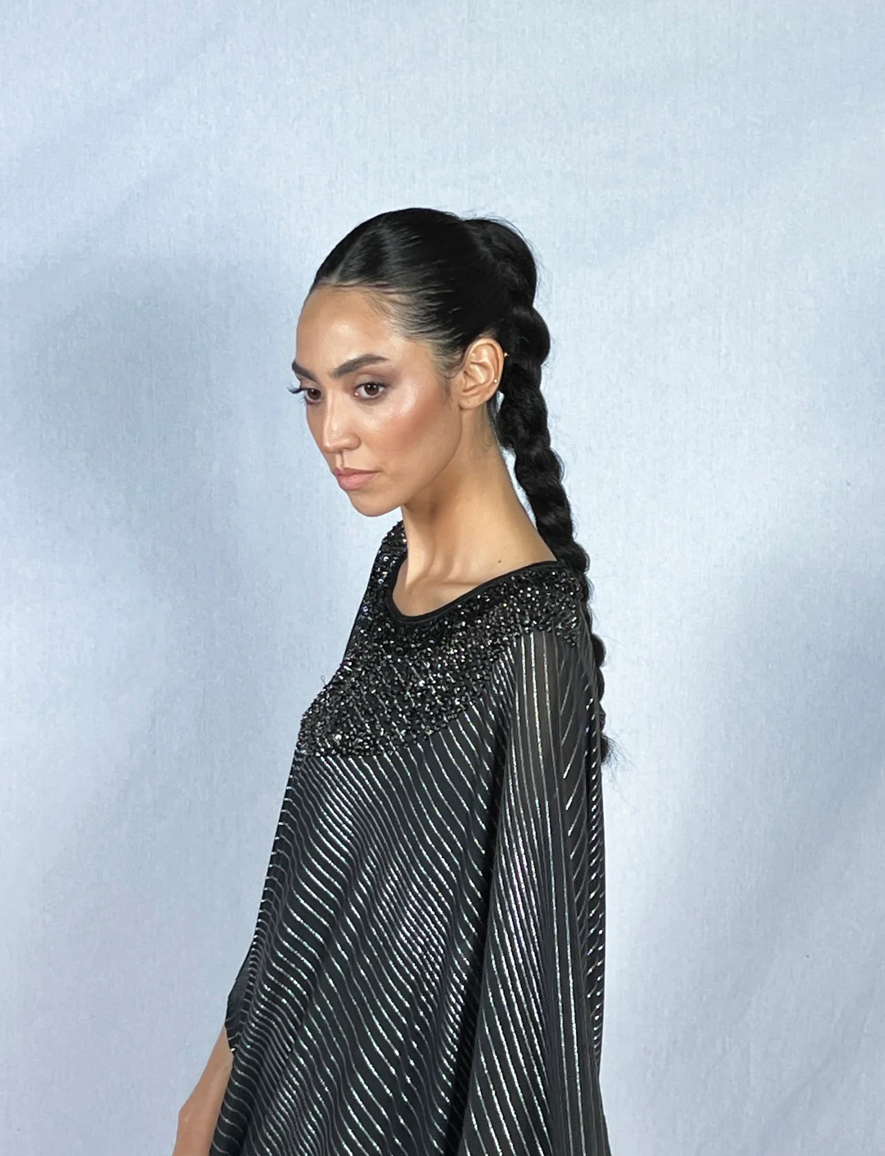 Broderies argentées sur soie noire, évoquant la beauté mystérieuse d'une nuit étoilée.