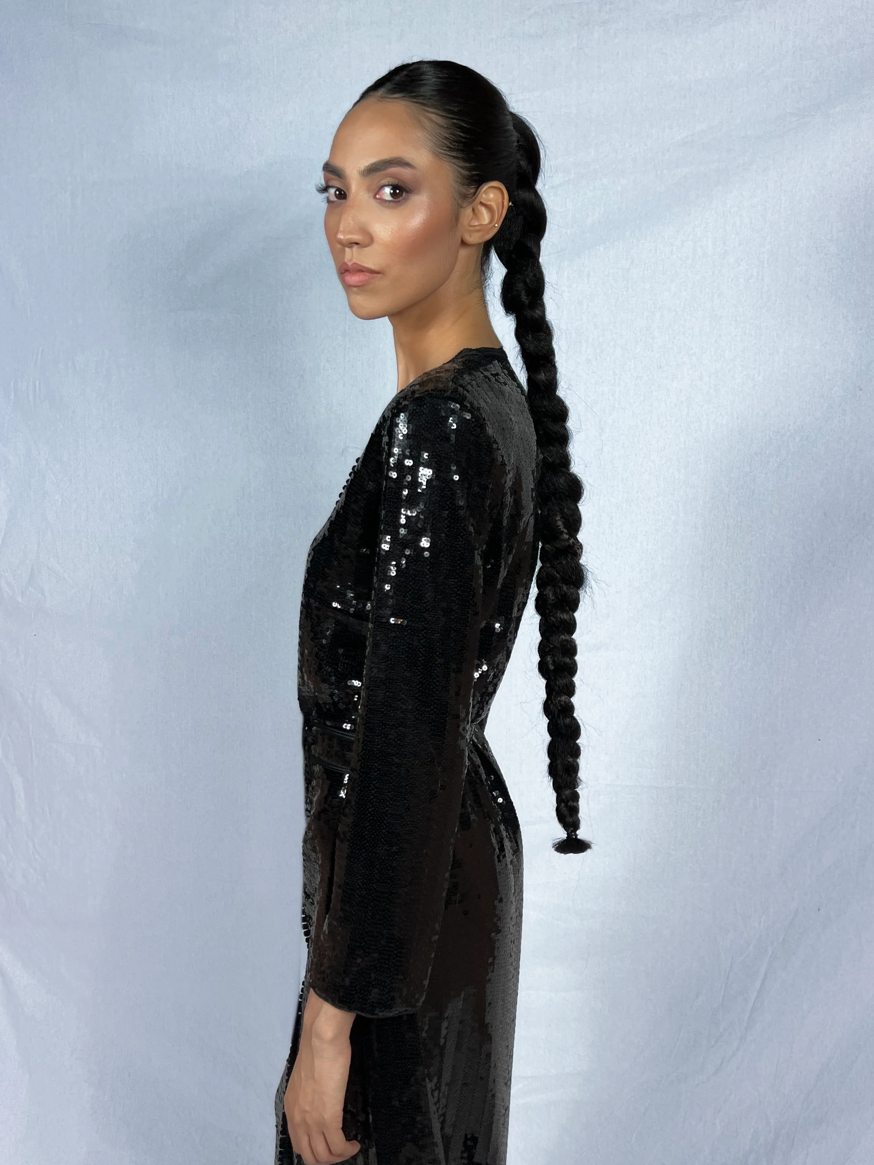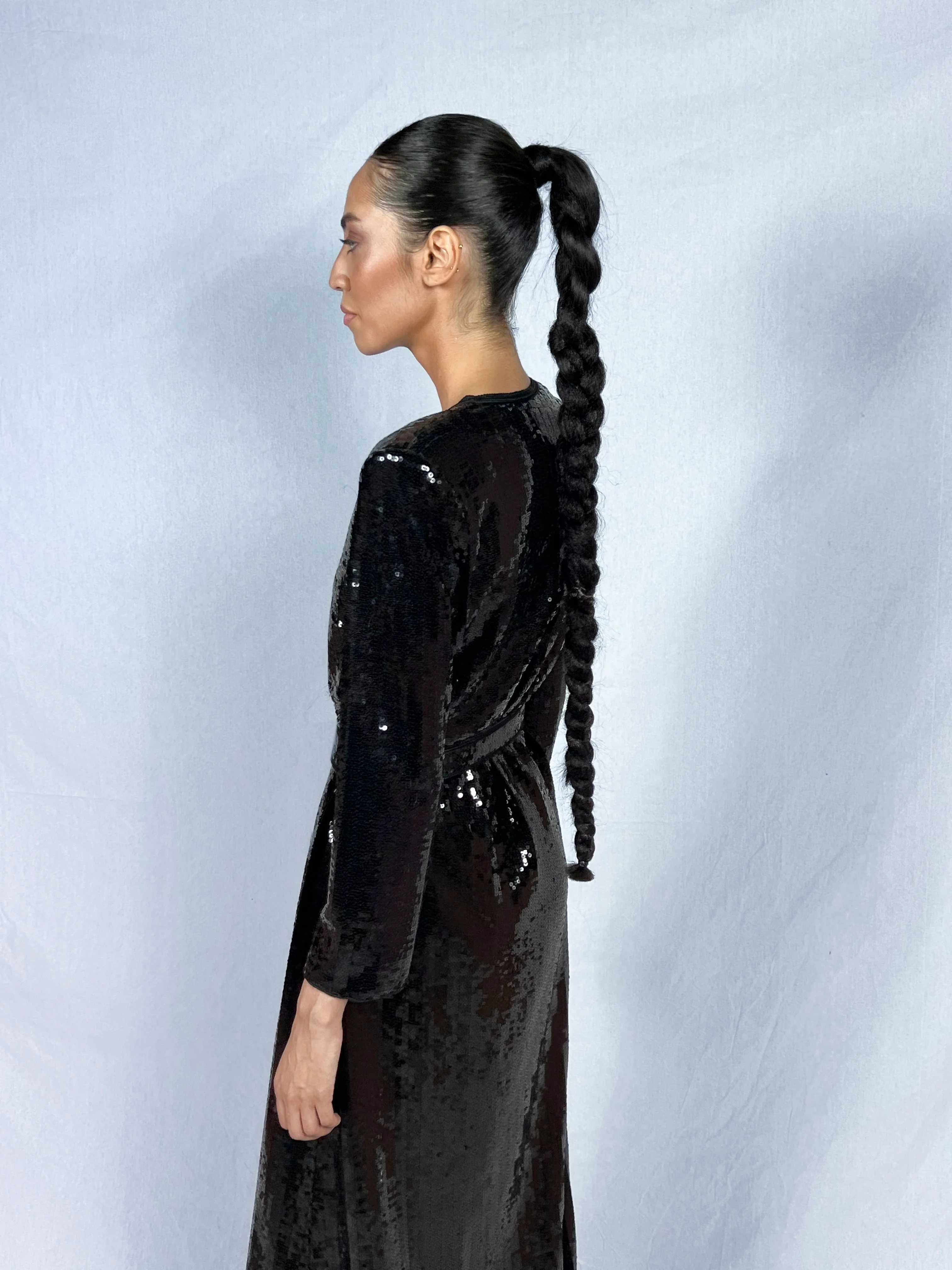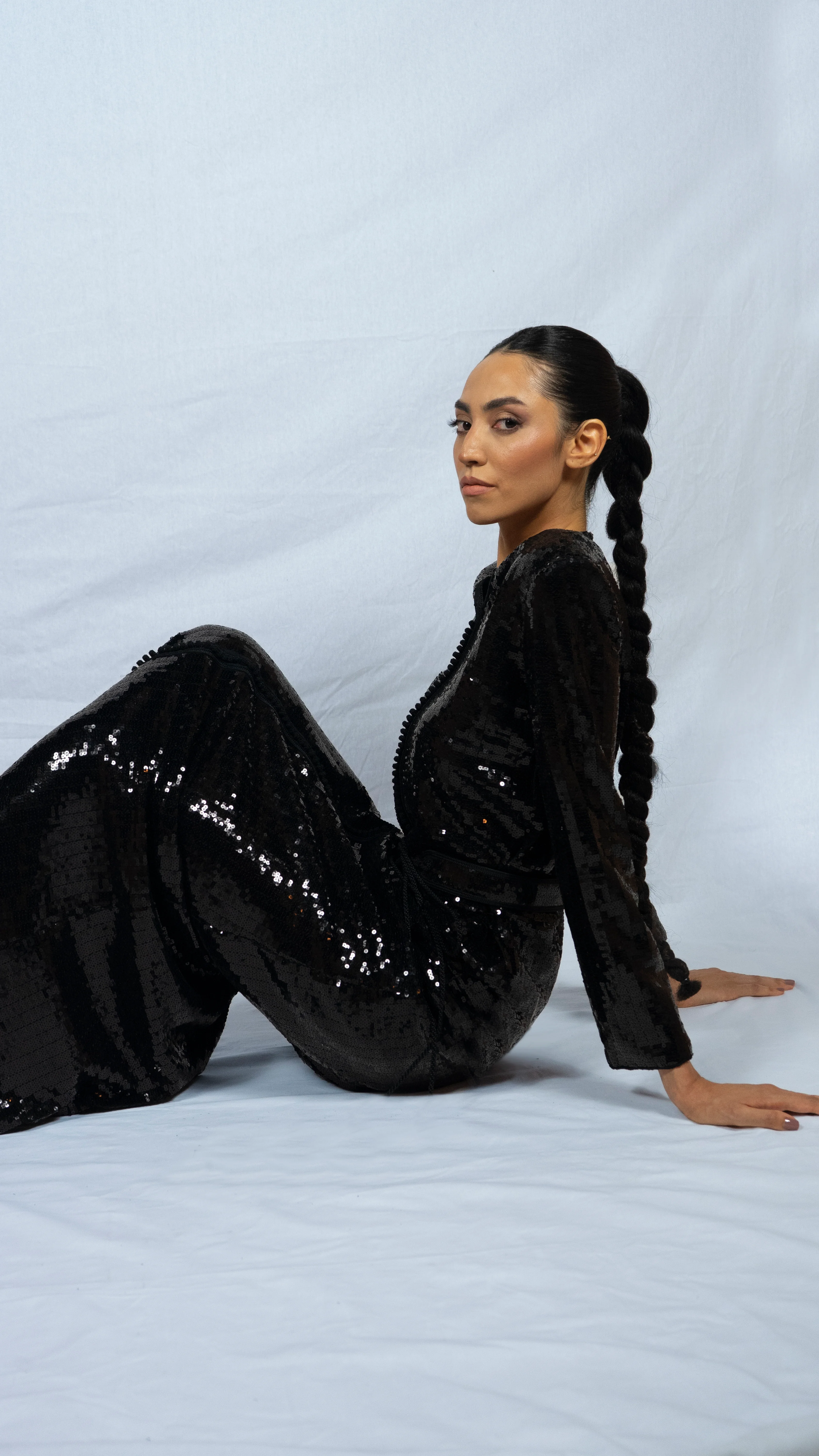 Une collection mystérieuse où les paillettes noires créent un jeu de lumière fascinant, incarnant l'élégance nocturne absolue.
