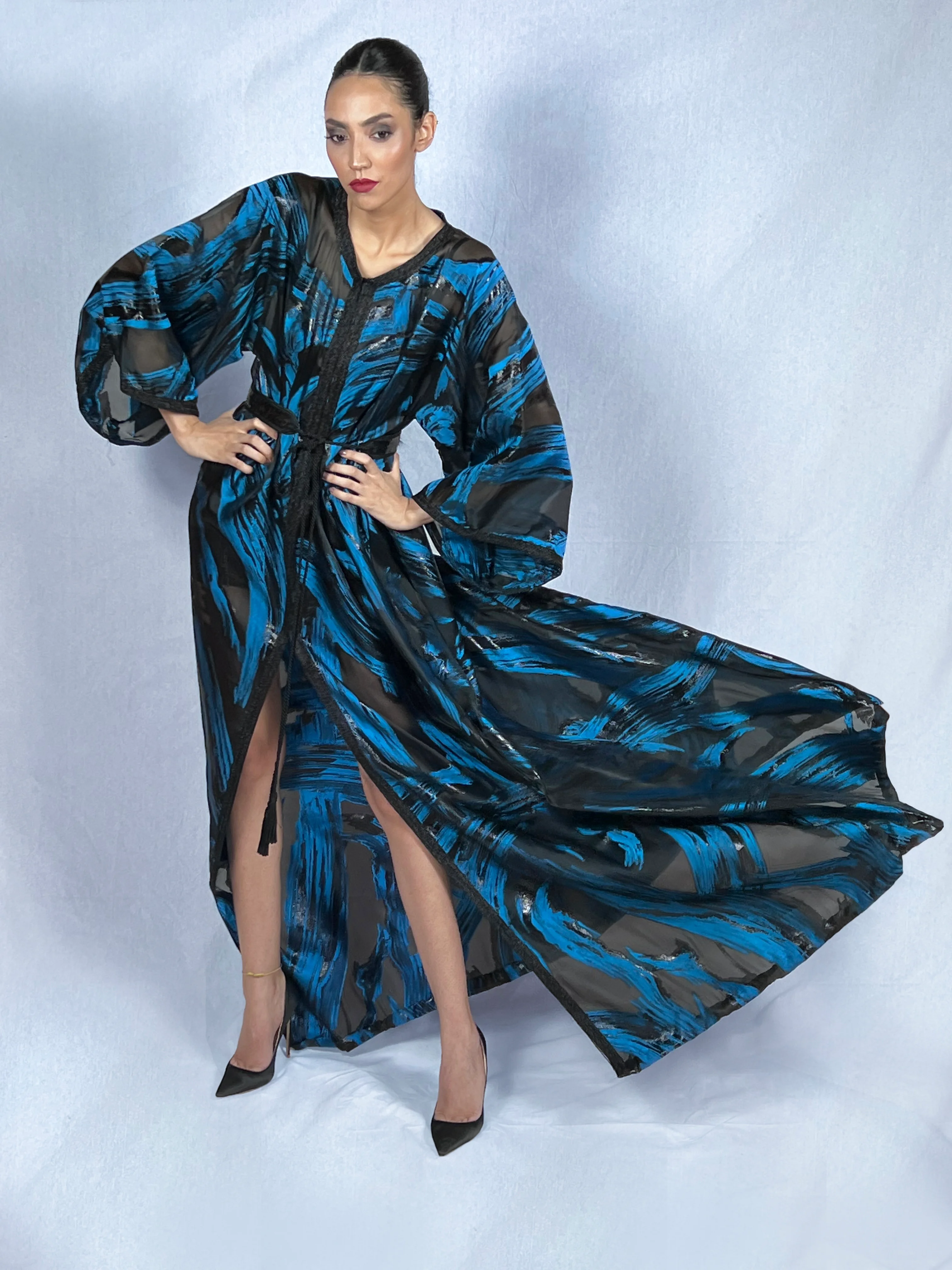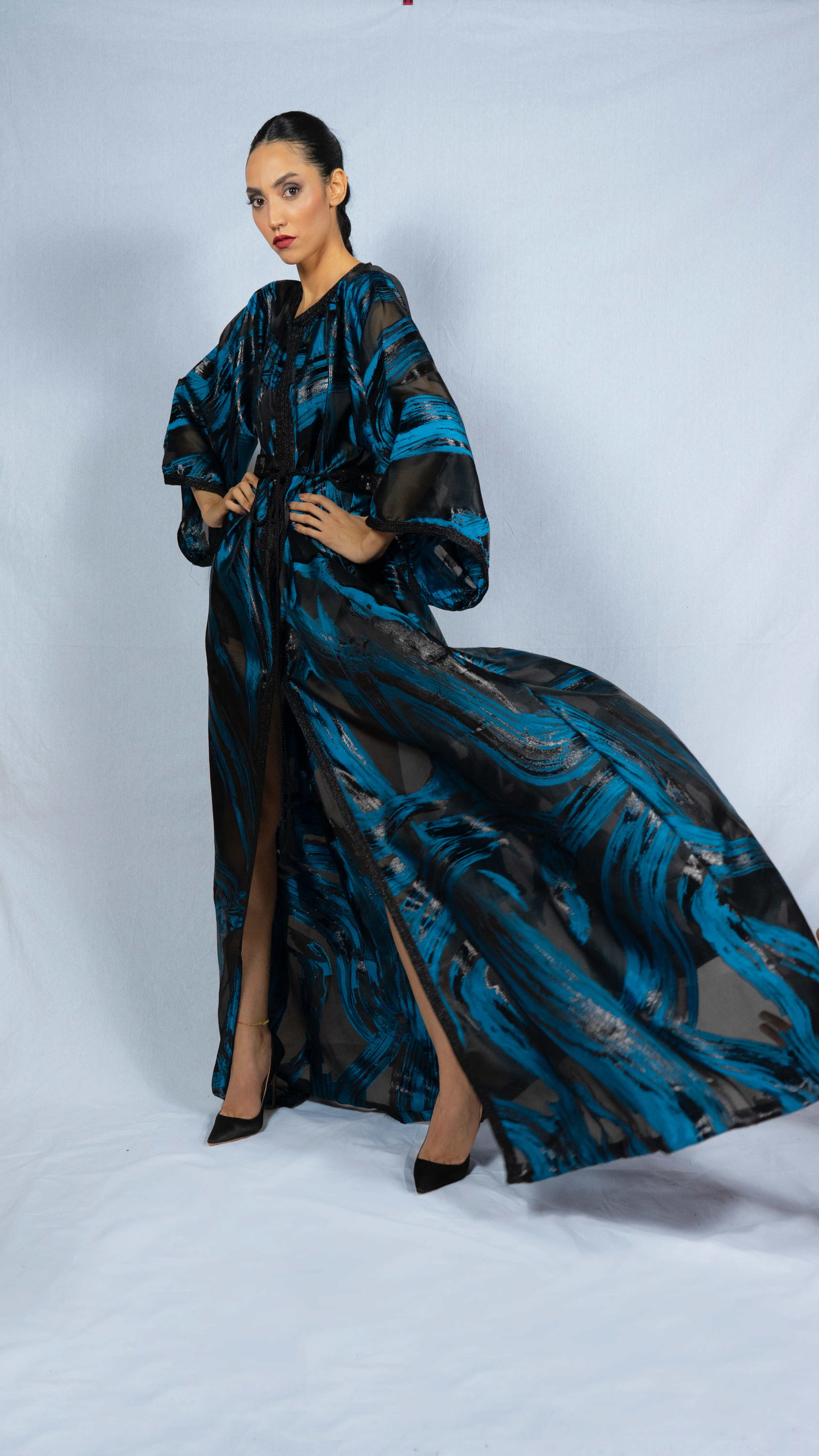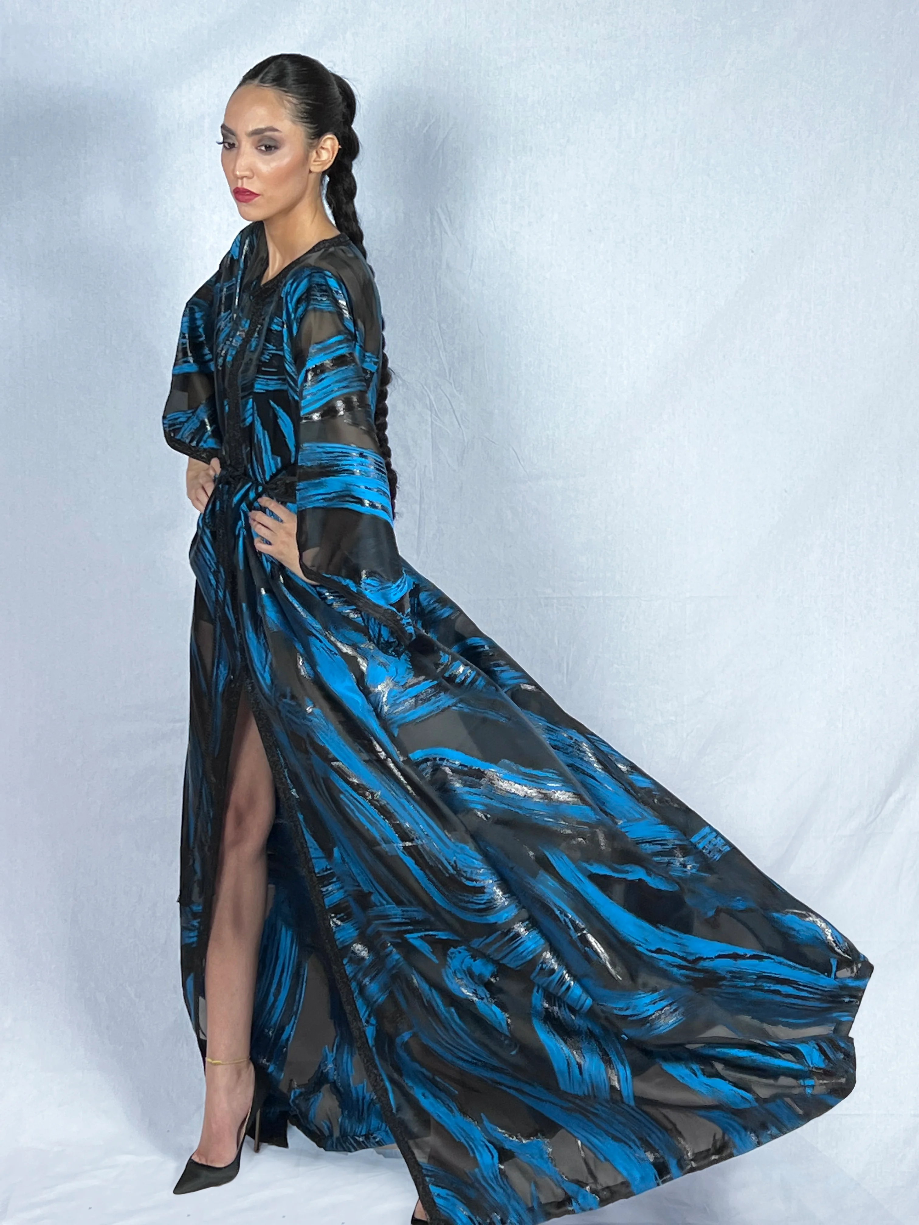 Une fusion audacieuse entre le noir profond et le bleu roi sur soie organza, créant une silhouette sophistiquée et moderne.